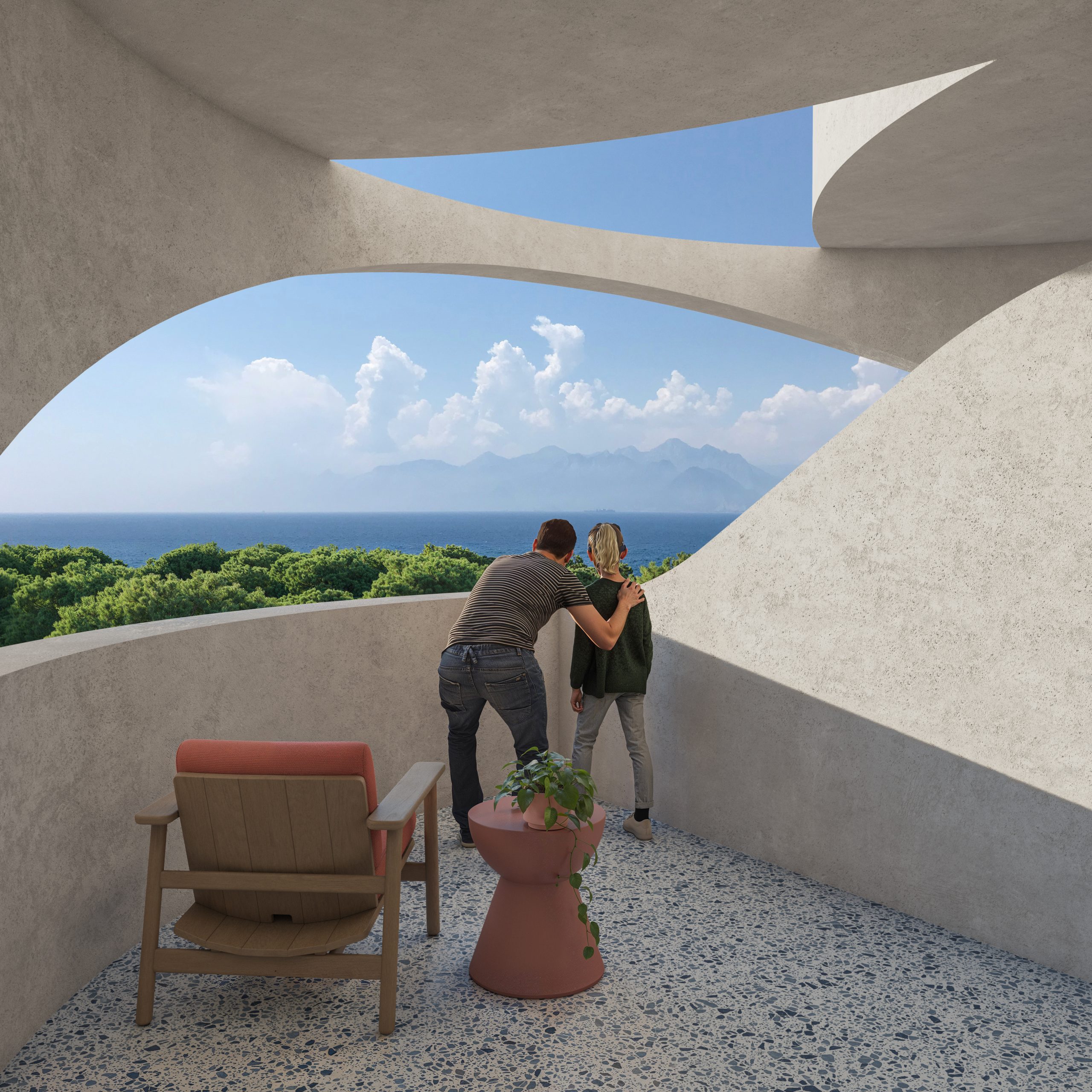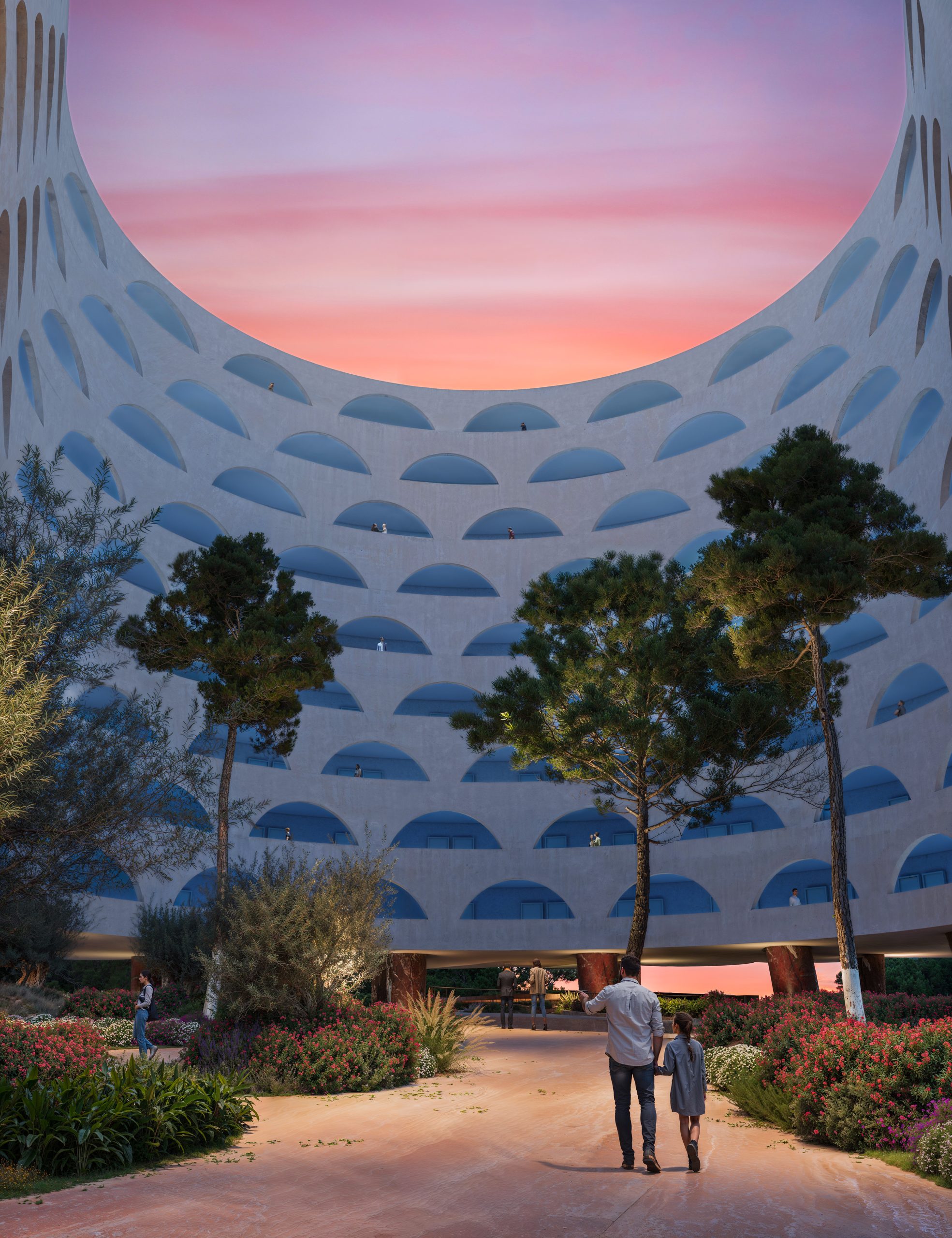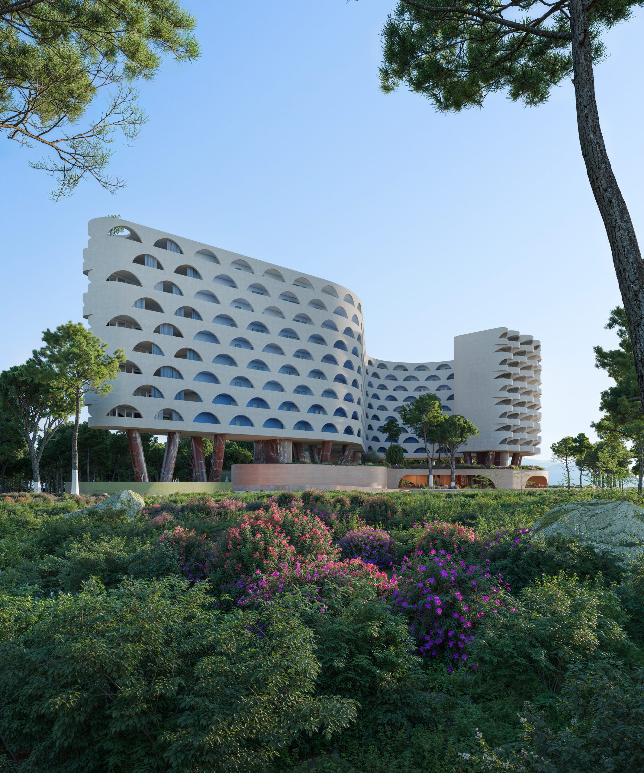 Set within the peaceful coastal landscape of Zvernec, Zërpentine is designed as a flowing architectural form that moves naturally through the terrain. Positioned just above the shoreline, the hotel connects forest and sea through a gentle path leading from the pine trees to the Ionian coast. Its curved structure allows every room to open toward dual horizons—capturing views of the blue sea and the surrounding greenery. The result is an immersive space where architecture and nature exist in quiet harmony.